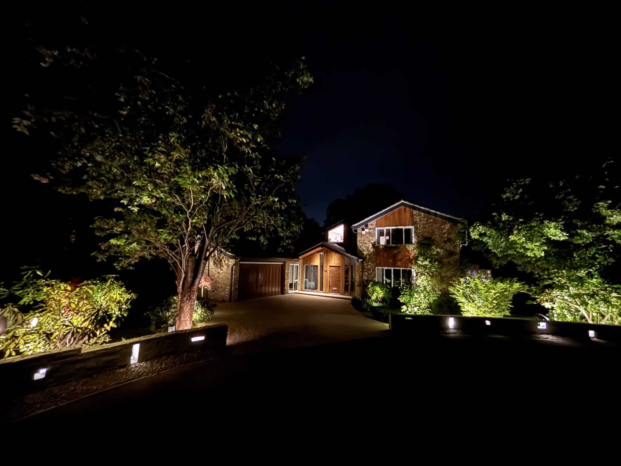 The boundary becomes a feature in its own right. Built from limestone rustic blocks, the wall is intentionally imperfect—no coping stones, no polished face—just honest texture and warmth. It’s lightly broken and see-through in places, with steel-lined openings that carry concealed lighting. At dusk, these apertures glow from within, sending bands of light across the garden and footpath while keeping sightlines open. It’s a wall that frames rather than fences, quietly subversive yet welcoming.